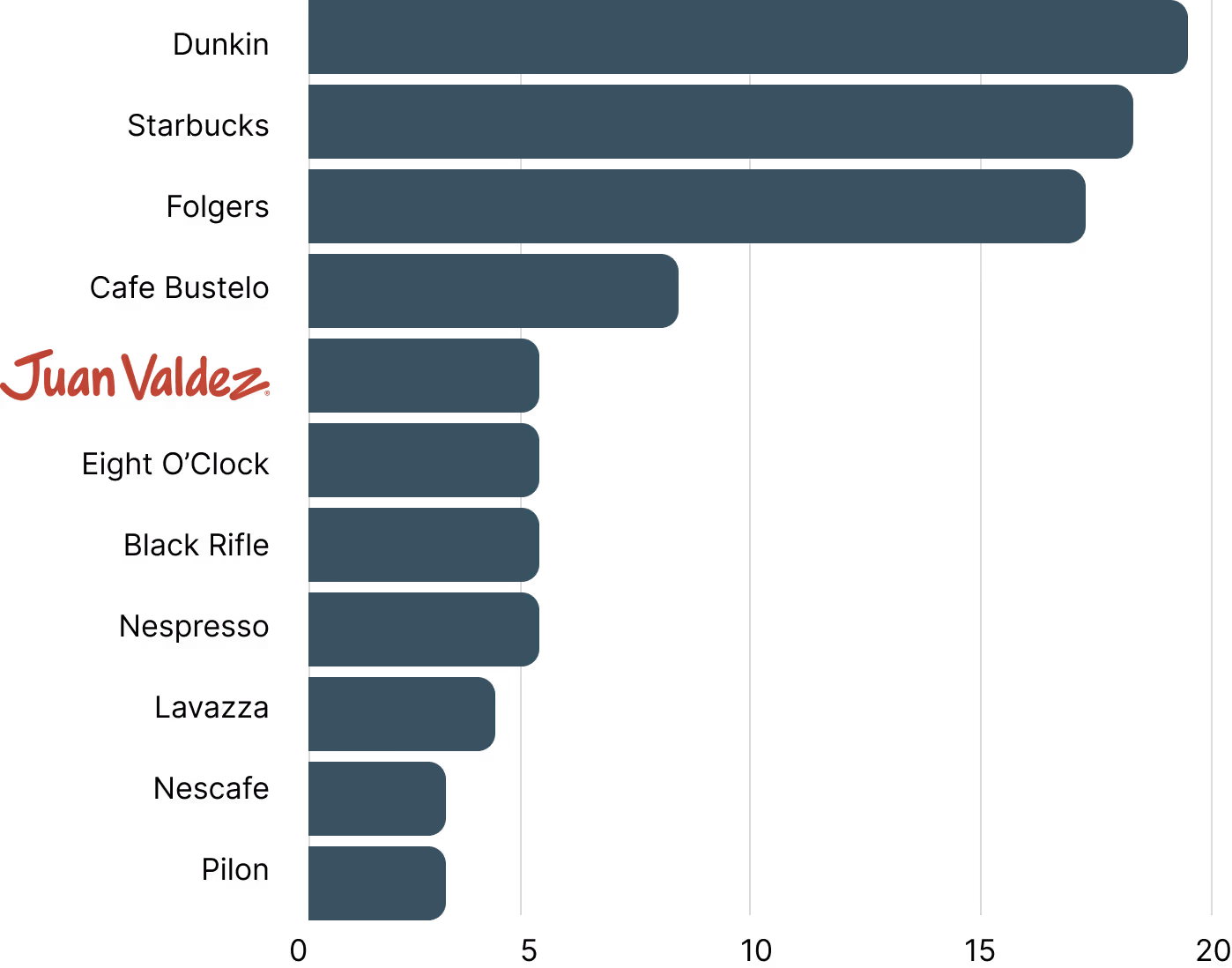Instantly recognized, trusted by millions, backed by decades of storytelling around quality and origin since 1959. Our exclusive third-party rights to sell Juan Valdez–branded coffee in the U.S. and Canada are invaluable. As you can see below, it is a top-5 coffee pick among many American consumers. Why? Colombian coffee is premium and Juan Valdez is Colombian coffee. It’s why we’re rapidly winning major deals coast to coast, from pro sports teams to national retailers.