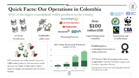 As the largest and only vertically integrated producer of Colombian coffee, we can sell premium, traceable coffee at competitive prices by controlling every step of the process, with an unbeatable farm-to-cup story that can truly scale beyond any competitor: